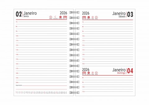 Descrição do produtoCapa dura. Miolo diário com 336 páginas, incluindo tabelas, índice telefônico, informações diversas, calendários de planejamento 2026 e 2027 - em papel Offset 60g – Formato 20 x 14,5 cm. C/caixinha branca lisa - Tamanho : 145x200mm